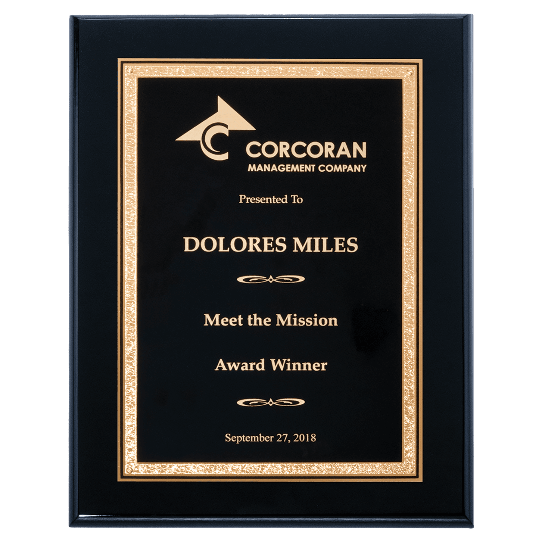 This beautiful Airflyte High Lustr black plaque features a black plate with gold Florentine design. Personalized to create a unique award, this stunning plaque is an ultimate recognition of excellence and achievement.
