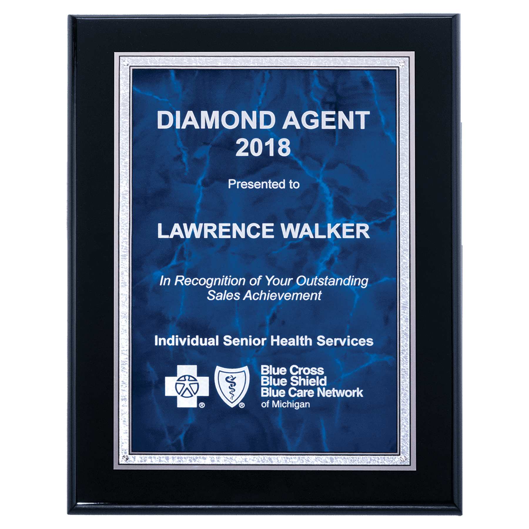 This beautiful Airflyte High Lustr black plaque features a sapphire marble plate with a silver Florentine border. Personalized to create an elegant, unique award, this plaque is an ultimate recognition of excellence and achievement.