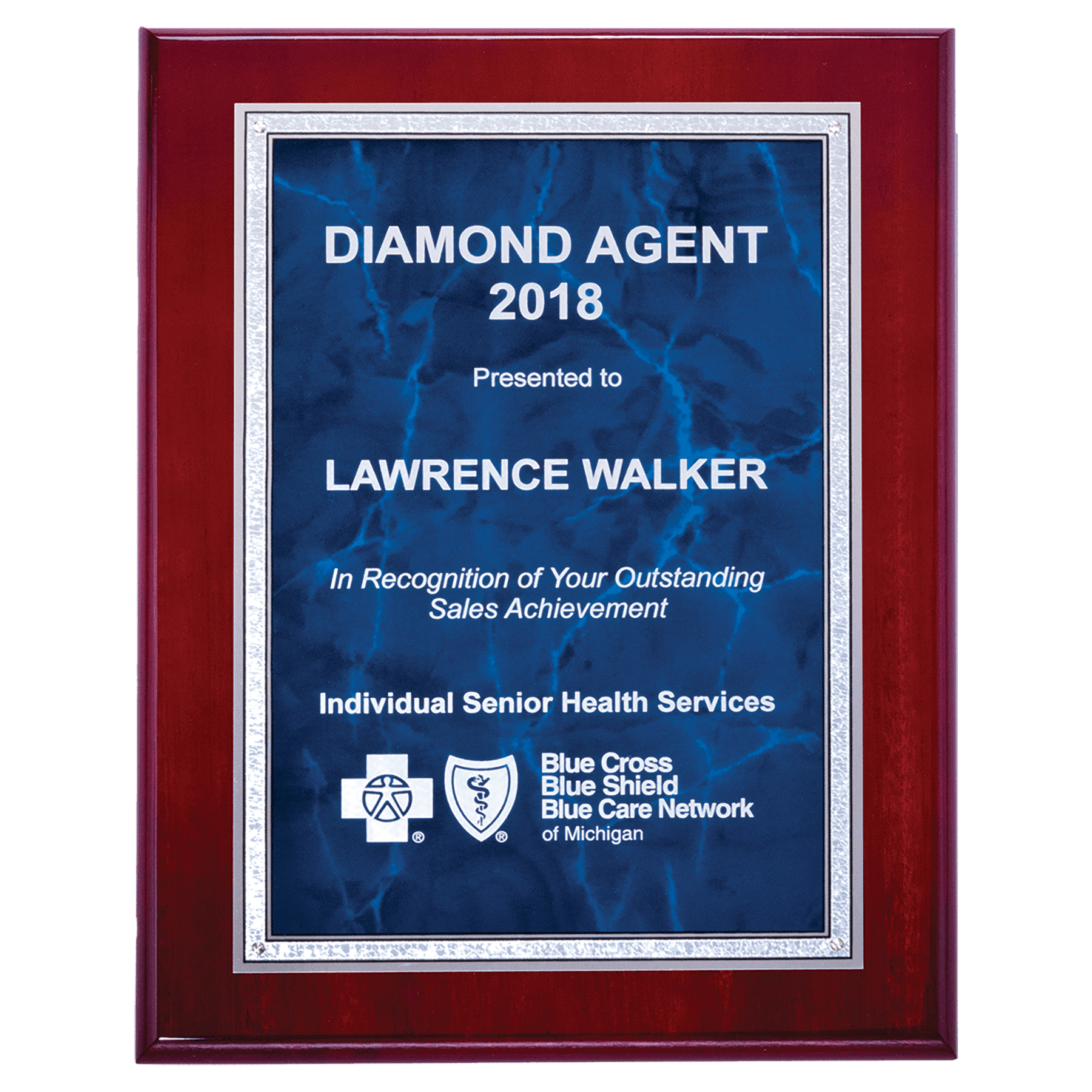 This beautiful Airflyte High Lustr rosewood plaque features a sapphire marble plate with a silver Florentine border. Personalized to create an elegant, unique award, this plaque is an ultimate recognition of excellence and achievement.