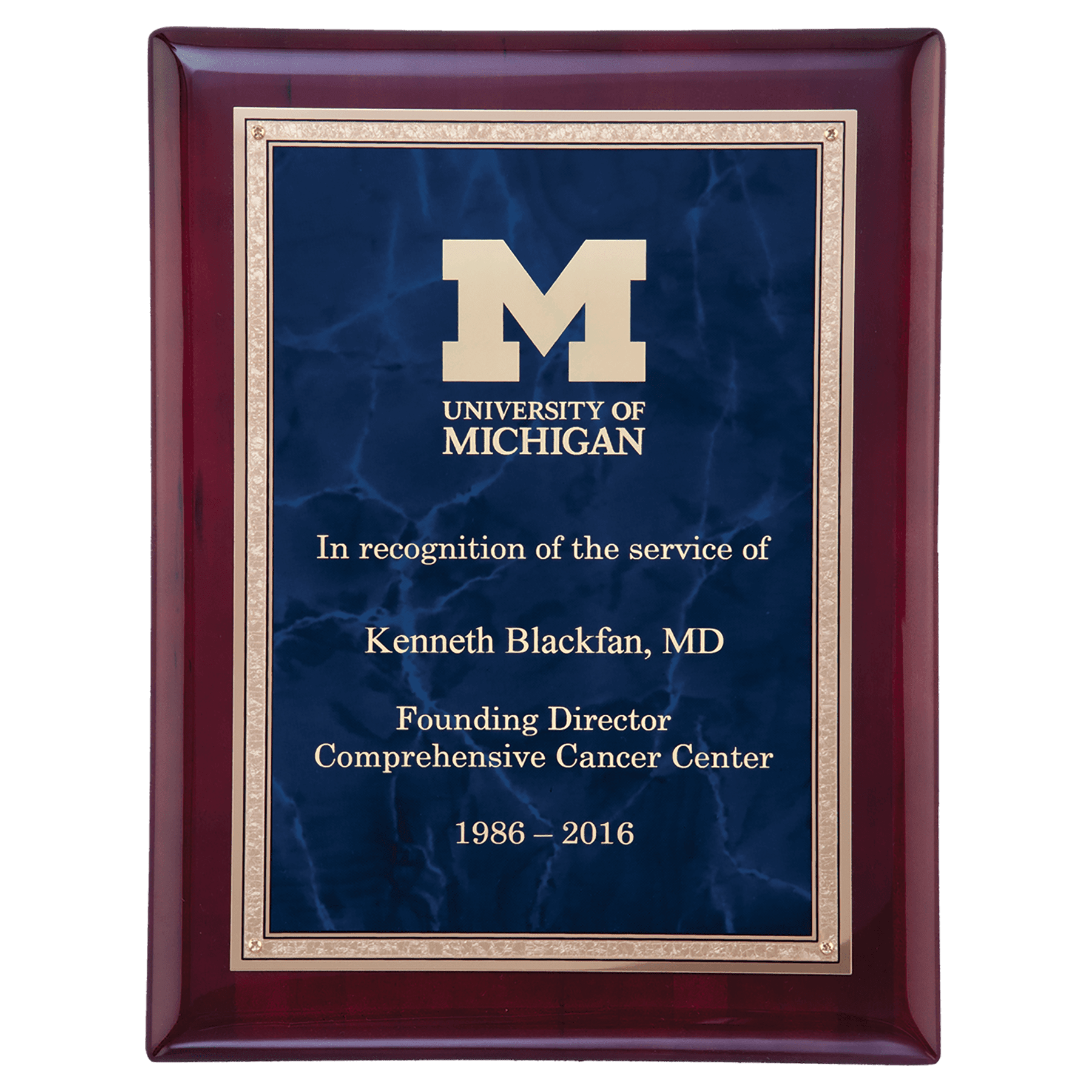 This beautiful Airflyte Premium Rosewood Piano Finish Plaque features a sapphire marble plate with a gold Florentine Border. This elegant plaque is one that definitely shows the ultimate recognition and appreciation of excellence.